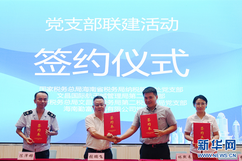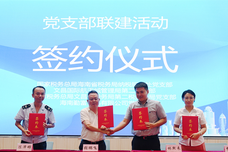 活动以“优化税费服务 助企创新发展”中小企业提级服务暨党支部联建签约仪式拉开序幕,国家税务总局文昌市税务局联合文昌国际航天城管理局、市科工信局、市工商联、企业代表共同签署了《支持和服务重点园区高质量发展合作协议》。同时,海南省税务局纳税服务处党支部与文昌市税务局第二分局党支部、文昌国际航天城管理局第二党支部、海南勤富食品有限公司党支部共同签署《党支部联建协议书》。