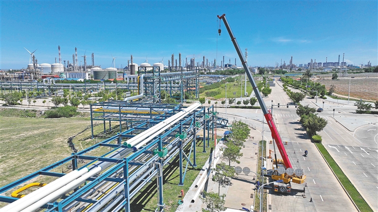 近日,在东方临港产业园,施工团队加紧建设管廊,完善园区基础设施,为园区企业的正常生产提供保障。