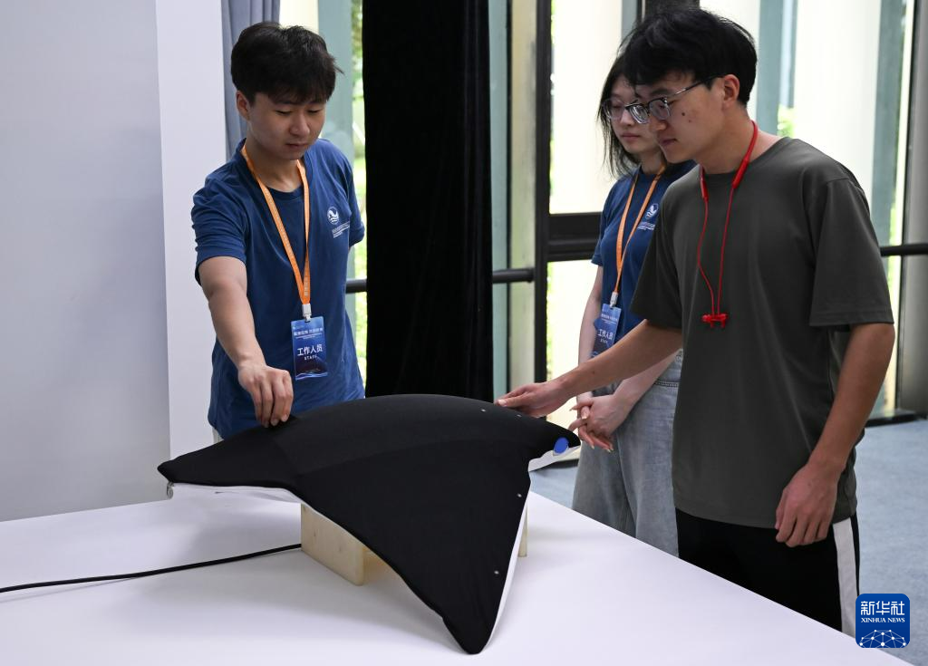 10月25日,观众在深海先进技术与装备展览上参观滑扑一体仿蝠鲼柔体潜水器。新华社记者 杨冠宇 摄