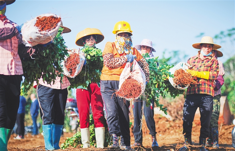 近日,海口市龙华区龙桥镇昌荣村油茶种植区内,村民进行平整土地、施底肥、挖坑,以及油茶种苗种植。通过全面推进油茶种植,让绿色扮靓美丽乡村的同时,又助力强村富民。图为村民搬运种苗到地里种植。海南日报记者 封烁 摄