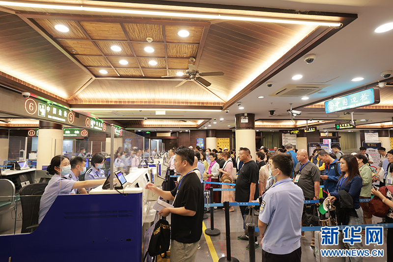 三亚边检站移民管理警察正在为旅客办理出境手续。新华网发(丛高 摄)