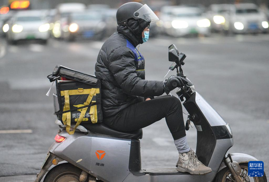 穿着棉衣戴着帽子的外卖骑手在海口市街头等待红绿灯(1月24日摄)。