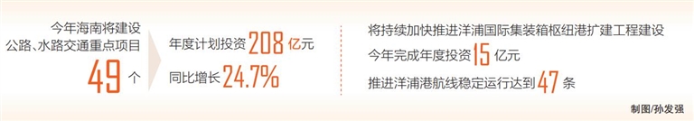 2月11日,海南日报记者从省交通运输厅获悉,为持续扩大有效投资,加快建设现代化交通基础设施体系,今年海南将建设公路、水路交通重点项目49个,年度计划投资208亿元,同比增长24.7%。