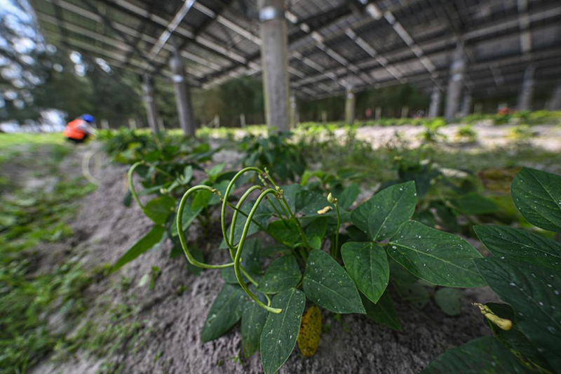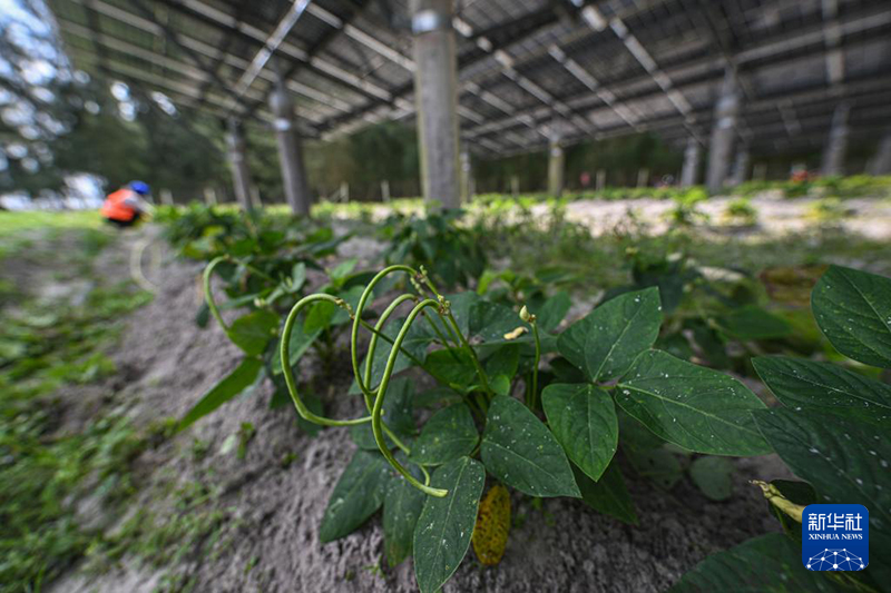 3月15日在位于海南省文昌市翁田镇王堂南村的龙虎山光伏蔬菜基地拍摄的豆角。海南省文昌市翁田镇王堂南村曾有不少沙质盐碱撂荒地。如今,昔日的盐碱撂荒地不仅持续产出绿电,还帮助不少当地村民就业增收。新华社记者 蒲晓旭 摄