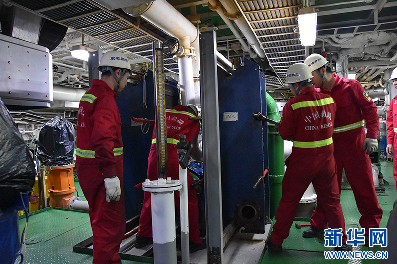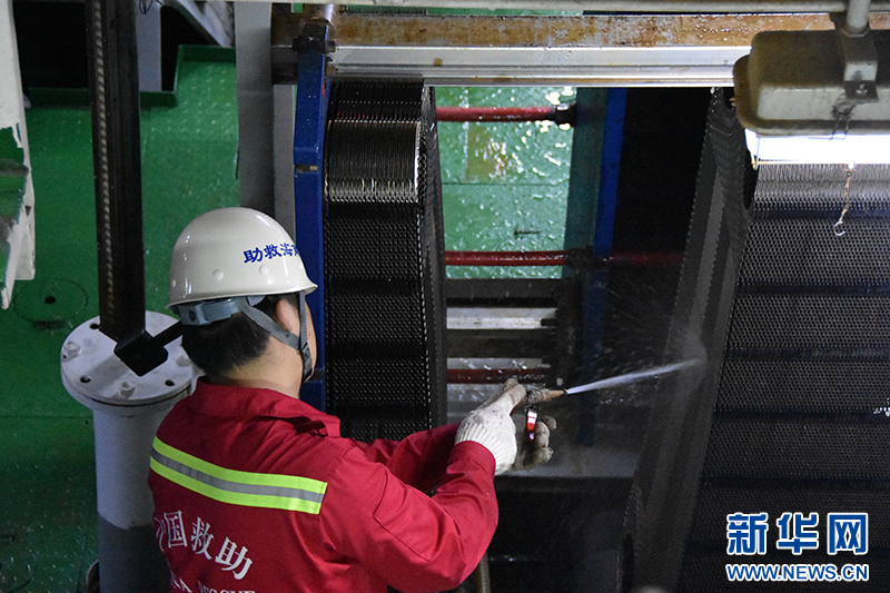 4月9日,轮机部人员正在机舱清洗主机中央冷却器。新华社记者 夏天 摄