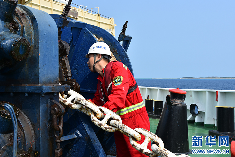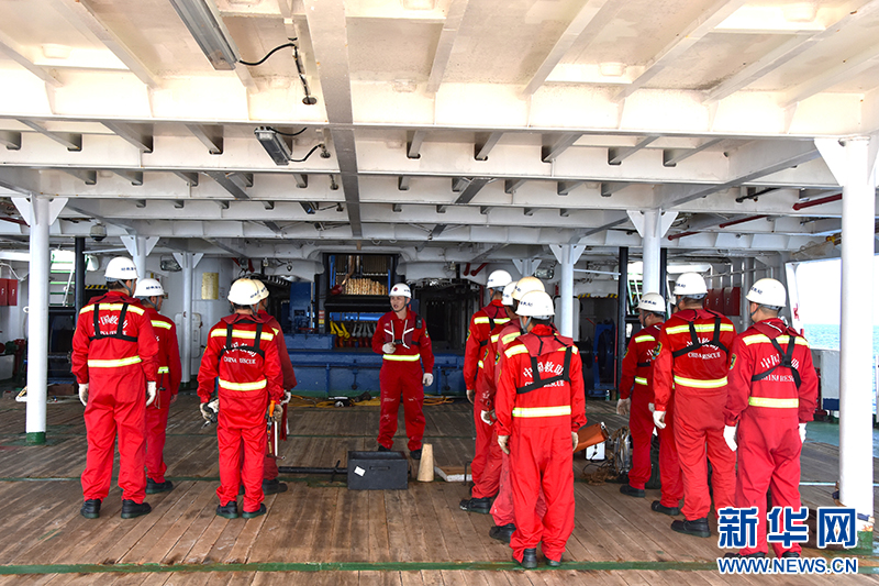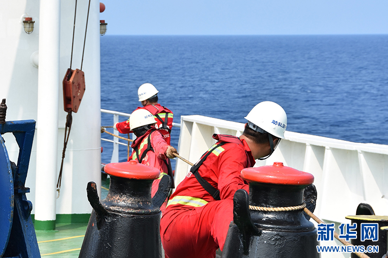 4月10日,甲板部人员正在安装甲板安全绳,以保障极端天气下甲板作业人员安全。新华社记者 夏天 摄
