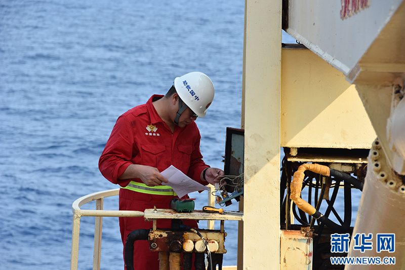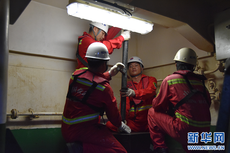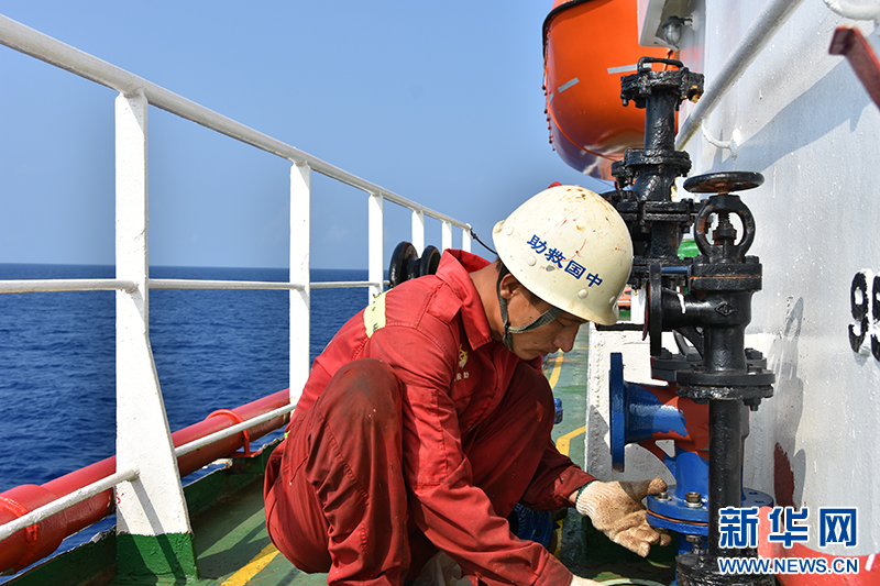 4月11日,水手长丁加松正在更换淡水舱注入口截止阀。新华社记者 夏天 摄