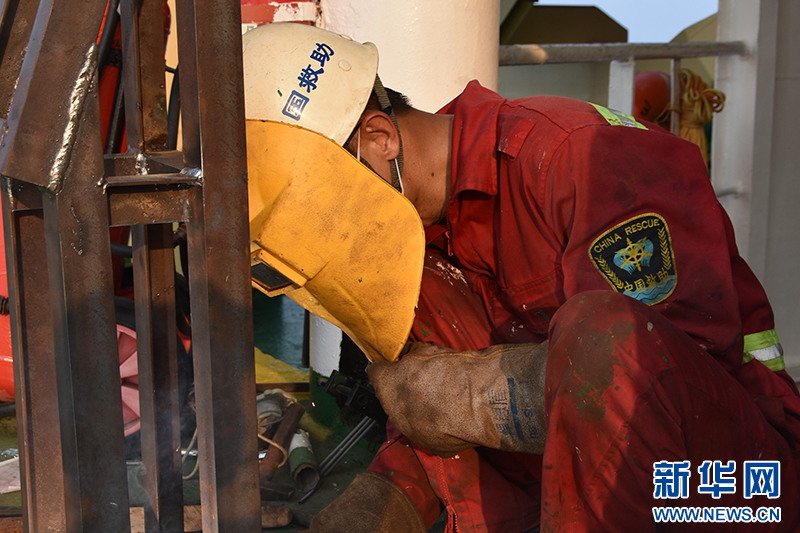4月7日,水手长丁加松正在焊接直升机起降信号灯固定支架。新华社记者 夏天 摄