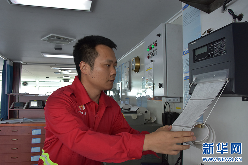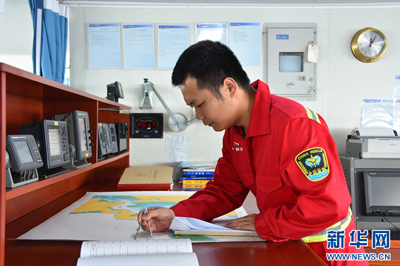 4月11日,二副曹赛强正在查收气象传真图。新华社记者 夏天 摄