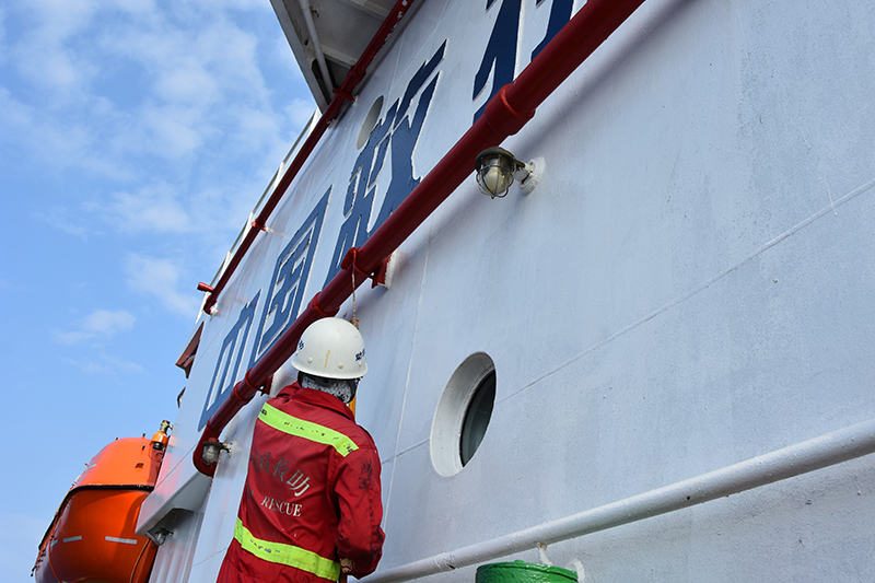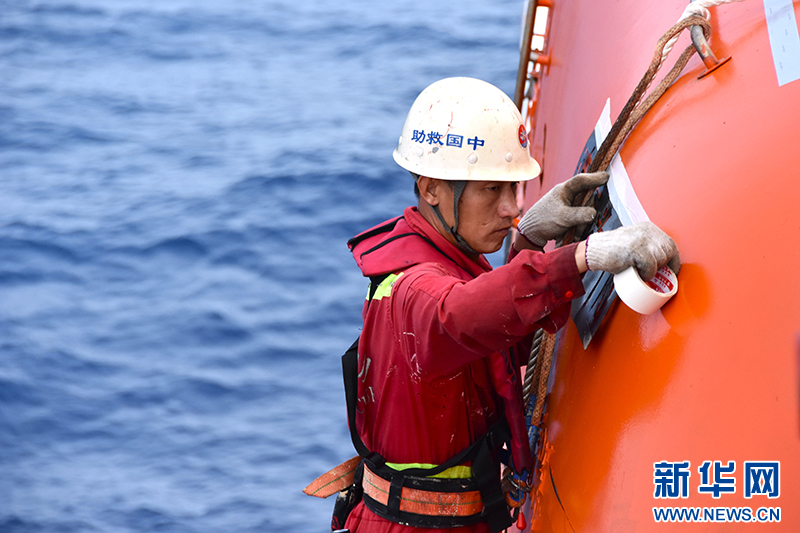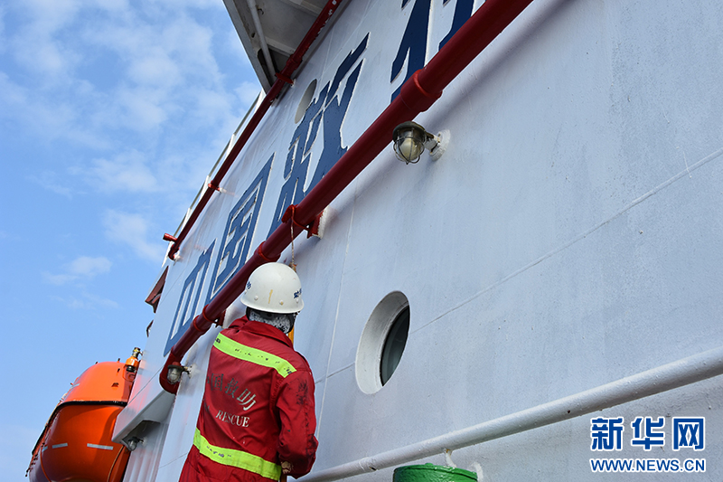4月8日,水手长丁加松正在为新上油漆的救生艇喷绘船名字样。新华社记者 夏天 摄