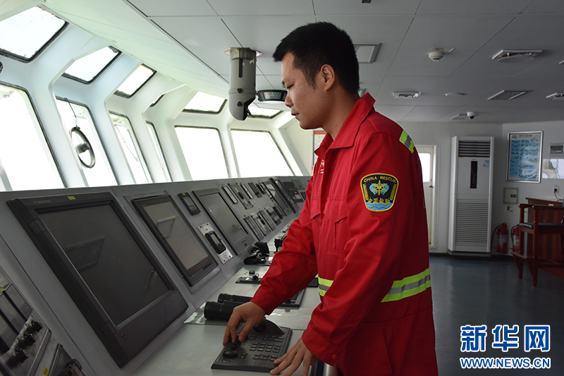4月10日,水手长丁加松正在主甲板检查测试救助舱的水密性。新华社记者 夏天 摄