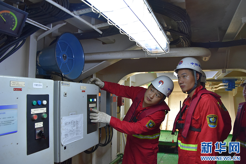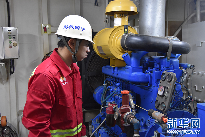 4月10日,二管轮陈为之正在检查保养应急发电机。新华社记者 夏天 摄