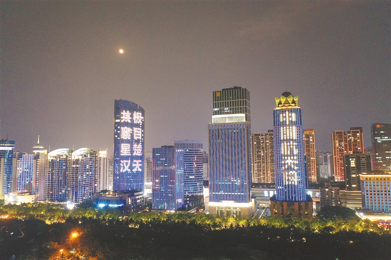 4月24日是第九个中国航天日。4月23日晚,海口滨海大道楼宇上演航天主题灯光秀,灯光秀以“极目楚天 共襄星汉”为主题,融合自然、科技与人文元素,展现宇宙探索与海南航天的重要地位。海南日报记者 邱肖帅 摄
