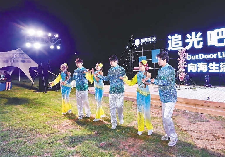 “听啊见凤啊说声,嘱姑九啊点半……”5月3日晚8时许,夜色暗下来了,暑气退下去了,另一种“火热”却在海南环岛旅游公路儋耳追光驿站的草坪上点燃起来了。来自海口的游客王焱与其他陌生的游客手拉着手,围着篝火,跟着儋州调声《嘱姑九点半》的旋律舞动起来,很是热闹。