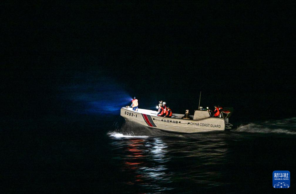在中国南沙群岛仁爱礁海域,海警执法员深夜乘舰载小艇赶往指定海域执行任务(4月5日摄)。新华社记者 蒲晓旭 摄