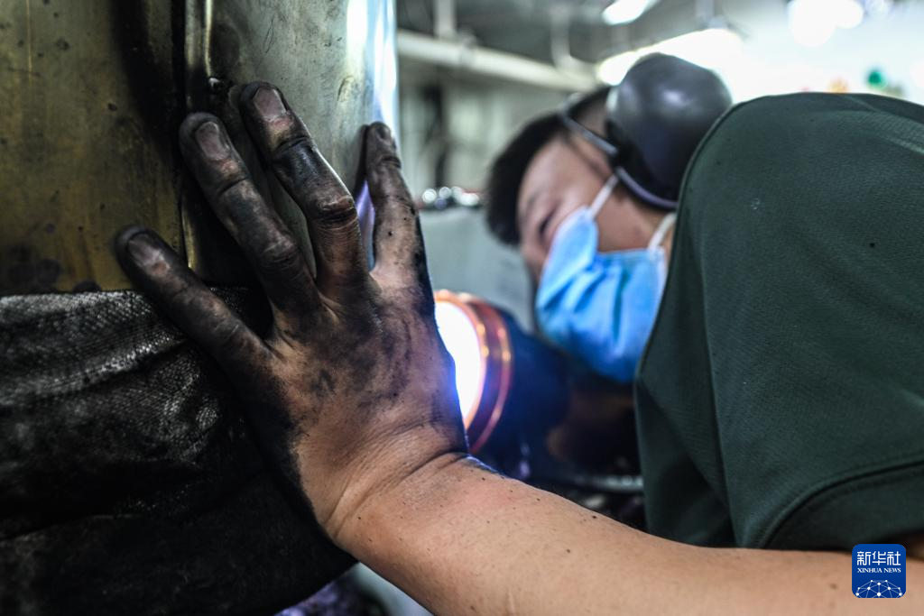在巡航值守于中国南沙群岛仁爱礁海域的华阳舰上,海警执法员在机舱检修设备时手上沾满油污(4月29日摄)。机舱内温度超过40℃,并伴有持续不断的轰鸣。新华社记者 蒲晓旭 摄