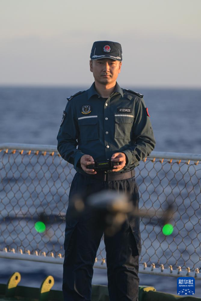在巡航值守于中国南沙群岛仁爱礁海域的华阳舰上,海警执法员进行无人机操控训练(4月9日摄)。新华社记者 蒲晓旭 摄