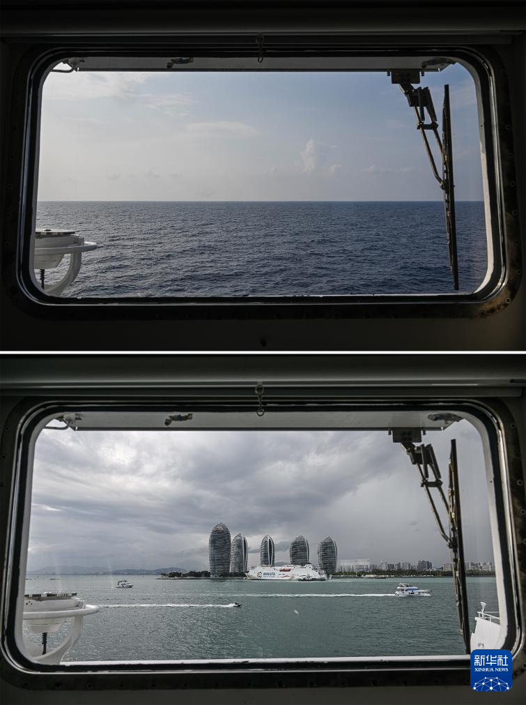 拼版照片:上图为5月23日在华阳舰上拍摄的舷窗外的南海海面;下图为5月15日华阳舰靠泊海南省三亚市时拍摄的舷窗外的海滨。新华社记者 蒲晓旭 摄