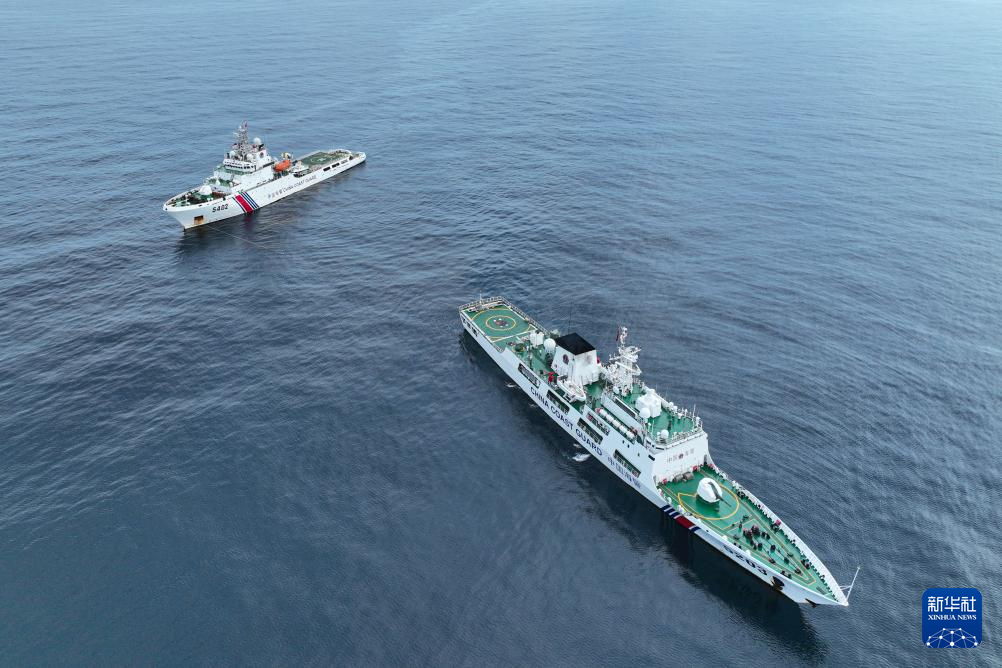 结束一轮仁爱礁巡航值守任务后,华阳舰在三亚市稍作休整,再次出海训练。这是华阳舰(右)在南海与其他海警舰进行海上拖带训练(5月21日摄,无人机照片)。新华社记者 蒲晓旭 摄