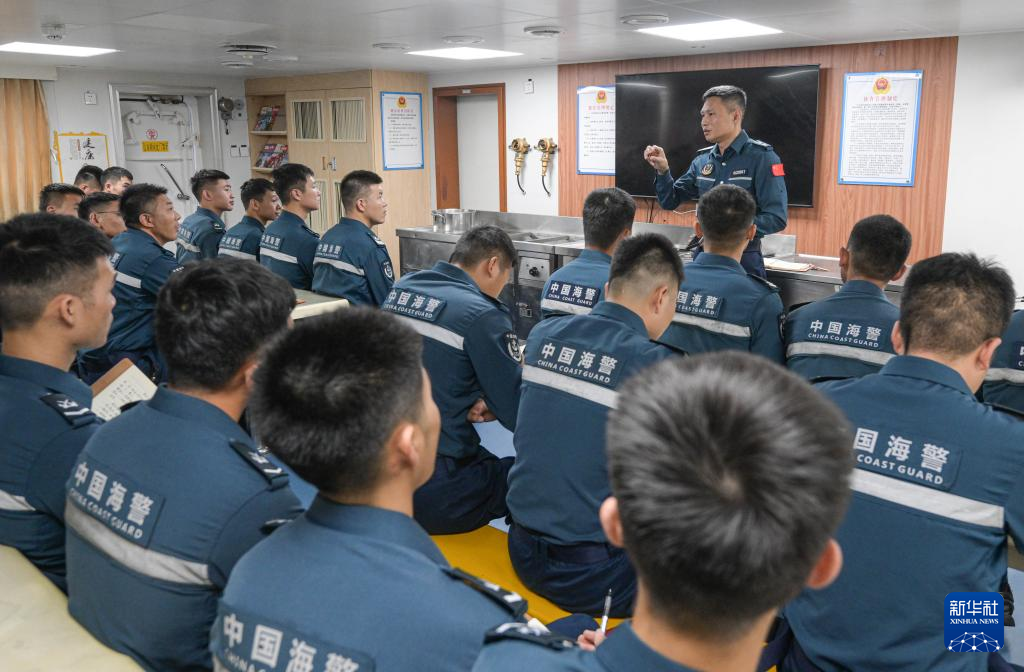 在巡航值守于中国南沙群岛仁爱礁海域的华阳舰上,海警执法员在上思想教育课(4月30日摄)。新华社记者 蒲晓旭 摄