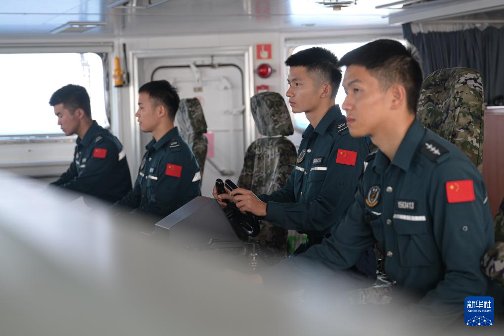 海警执法员在位于中国南沙群岛仁爱礁海域的华阳舰驾驶室值守(4月23日摄)。新华社记者 蒲晓旭 摄