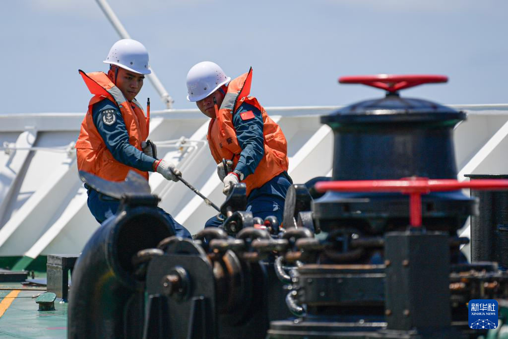 在巡航值守于中国南沙群岛仁爱礁海域的华阳舰上,海警执法员演练翻转锚链(5月6日摄)。新华社记者 蒲晓旭 摄