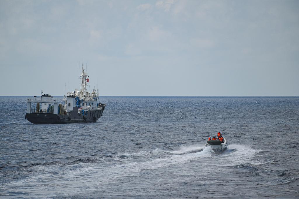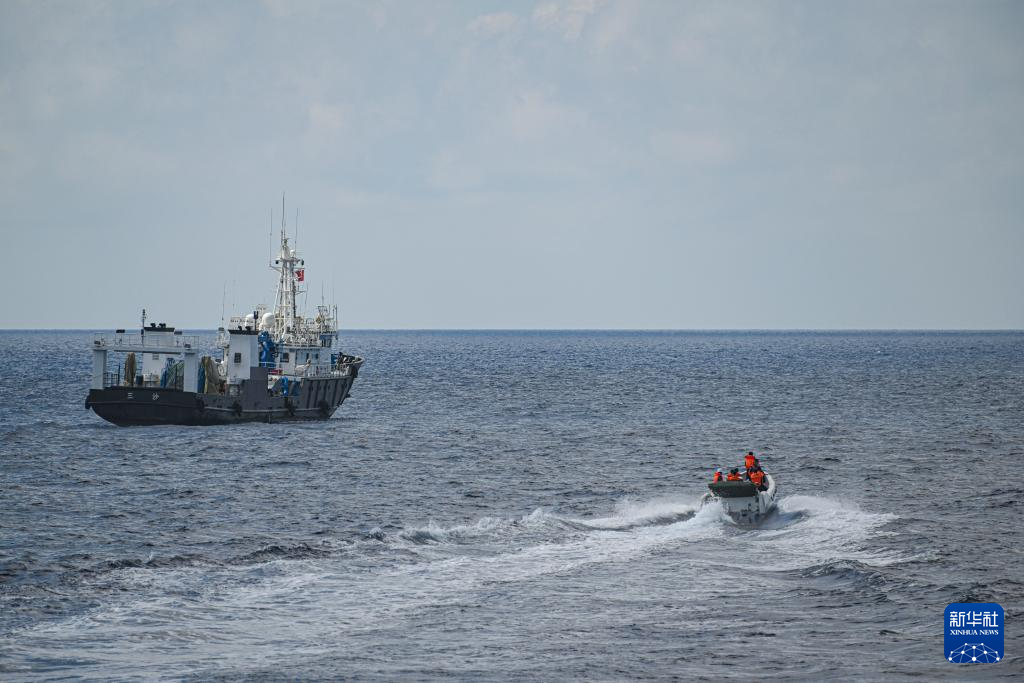 在中国南沙群岛仁爱礁海域,海警执法员走访附近的渔船(4月2日摄)。新华社记者 蒲晓旭 摄