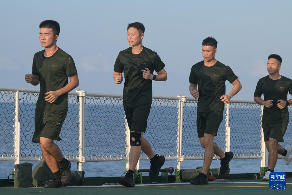 海警执法员在巡航值守于中国南沙群岛仁爱礁海域的华阳舰甲板上跑步(4月22日摄)。新华社记者 蒲晓旭 摄