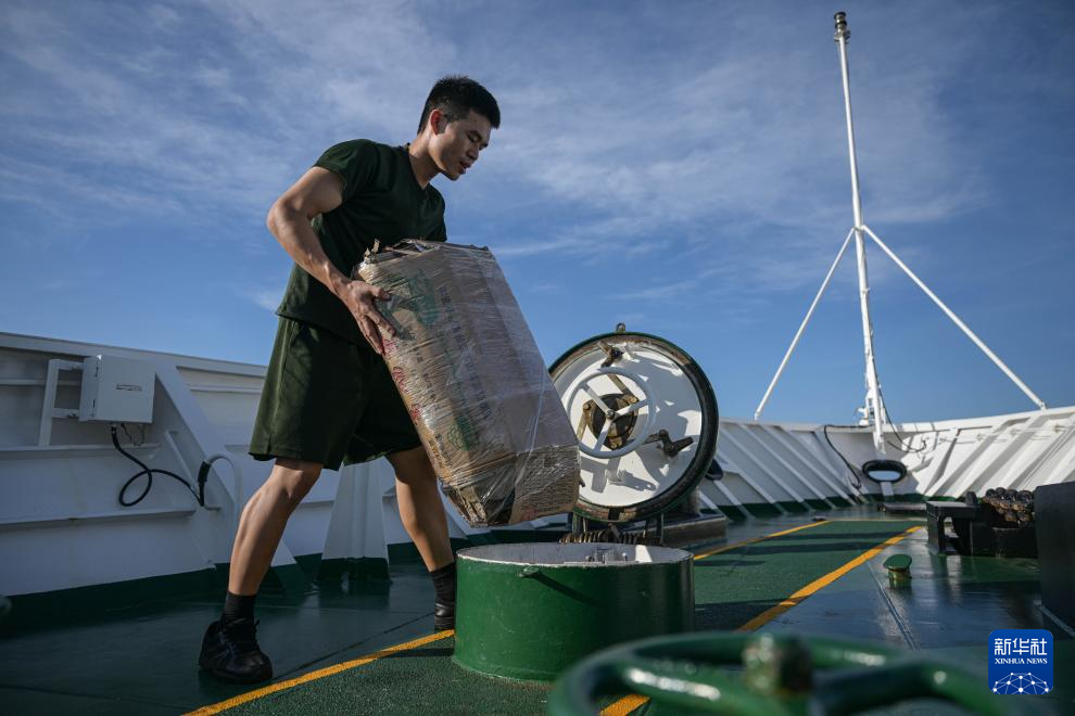 在巡航值守于中国南沙群岛仁爱礁海域的华阳舰上,海警执法员将生活垃圾打包后封存(4月25日摄)。新华社记者 蒲晓旭 摄