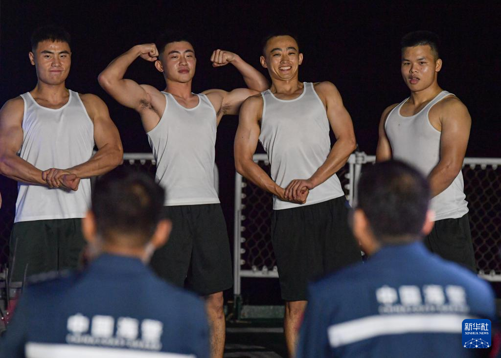 在巡航值守于中国南沙群岛仁爱礁海域的华阳舰甲板上,海警执法员们在舰庆晚会上表演节目(4月26日摄)。新华社记者 蒲晓旭 摄