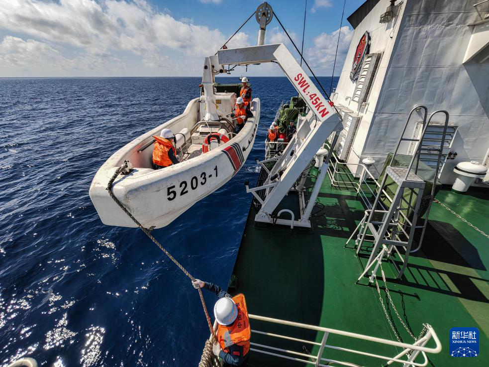 在中国南沙群岛仁爱礁海域,海警执法员吊放舰载小艇至海上训练(4月2日摄)。新华社记者 蒲晓旭 摄