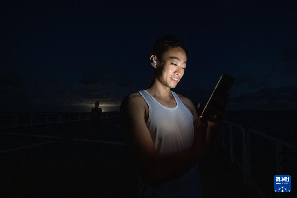 在巡航值守于中国南沙群岛仁爱礁海域的华阳舰上,一名海警执法员与家人视频通话(4月14日摄)。新华社记者 蒲晓旭 摄