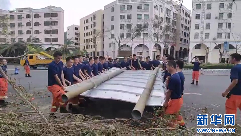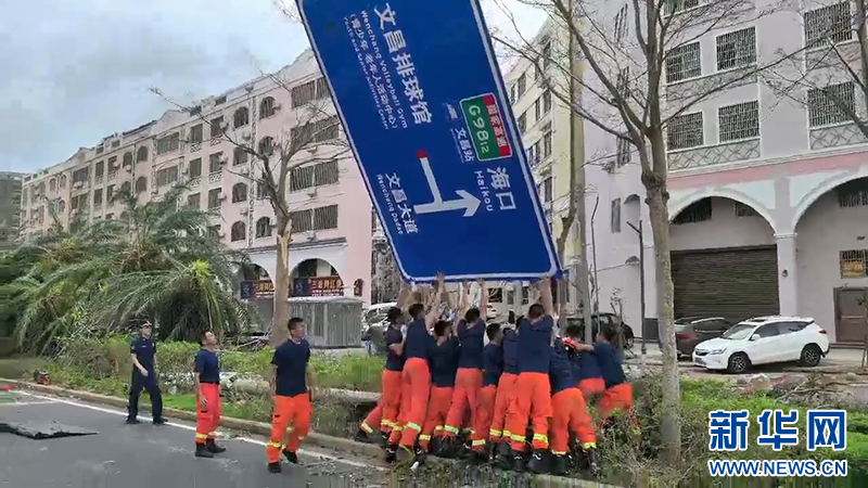 国家消防救援局海南机动队伍齐心协力举起被台风刮倒的道路指引牌。新华网发
