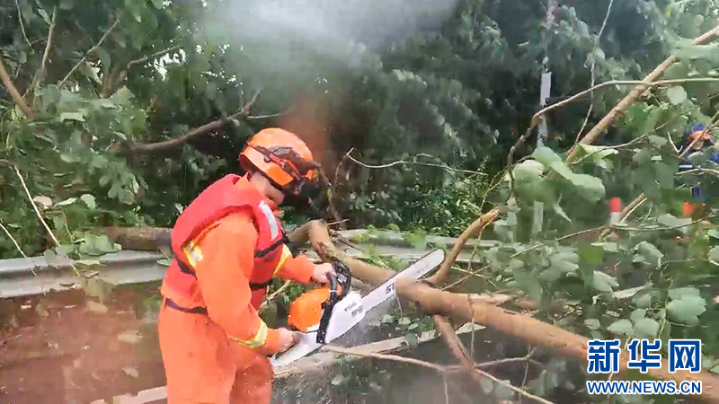 国家消防救援局海南机动队伍清理道路上倒伏的树木。新华网发