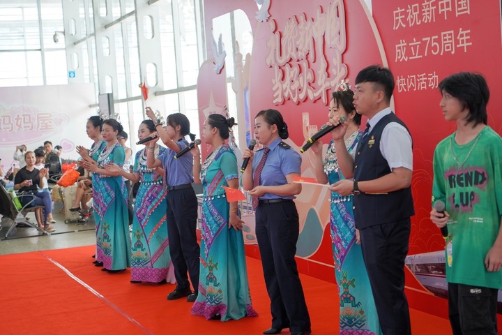 “五星红旗迎风飘扬,胜利歌声多么响亮……”动人的旋律朗朗上口,引发现场大合唱。充满深情的歌声,不仅激起在场每一个人的爱国热情,也为即将踏上旅途的乘客送去最美好的祝福。大家挥舞着手中的红旗,共唱熟悉的歌谣。