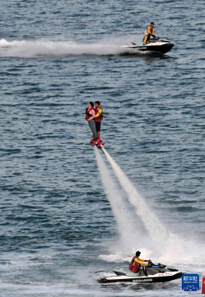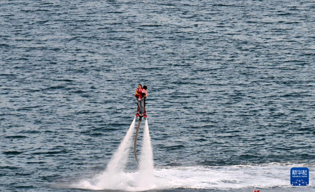 10月14日,游客在三亚市大东海旅游区体验水上项目。新华社记者 赵颖全 摄