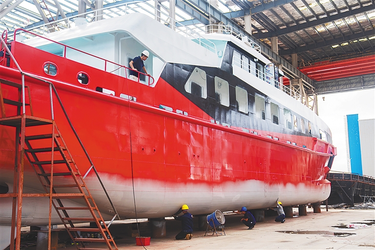 10月15日,位于临高县金牌港开发区的海荃新能源游艇制造有限公司,工作人员抓紧时间,对一艘海上风力发电运维船进行最后修缮。据悉,该船为36米双体风电运维船,属于低速排水量型、单底、单壳、单甲板、中尾机型双体船,用于海上风电场运维保养服务。