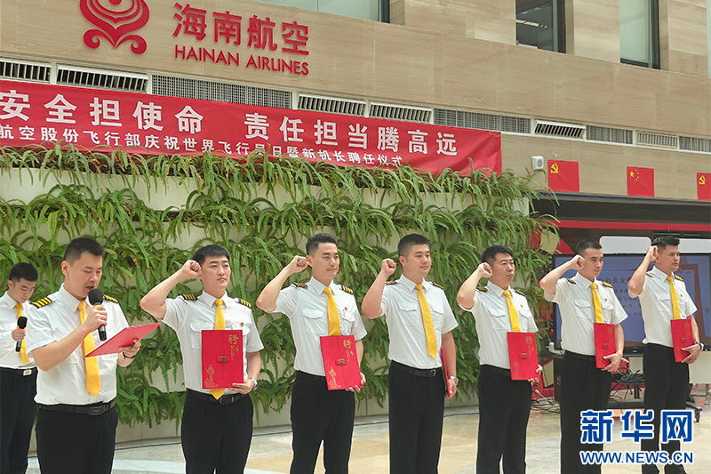 海南航空举办庆祝世界飞行员日暨新机长聘任活动,新机长们庄严宣誓。新华网发