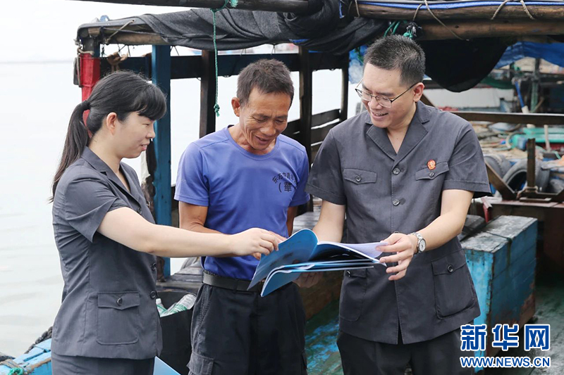 2021年6月4日,海南省二中院开展保护海洋生态环境普法宣传活动,图为法官向渔民宣传禁止捕捞的国家重点保护野生动物。新华网发
