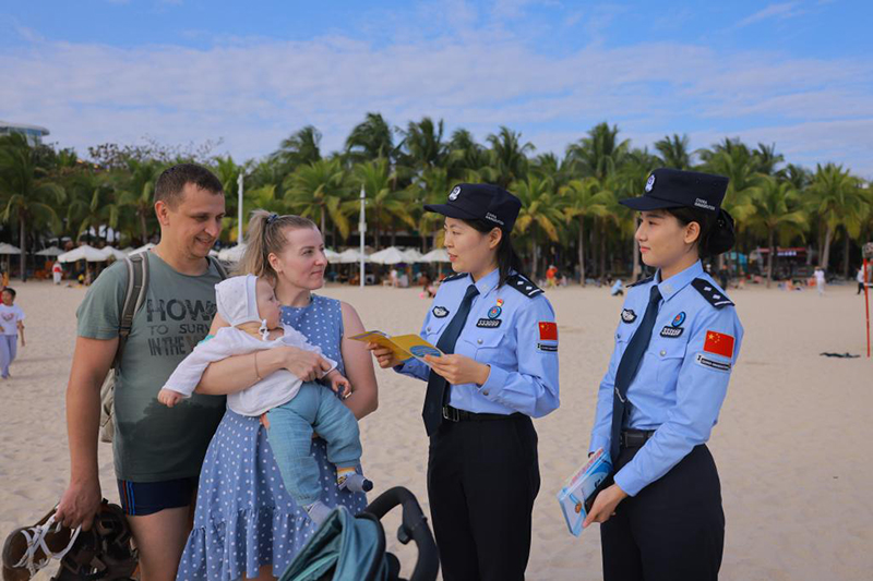 活动当日,三亚边检站移民管理警察与红沙海岸派出所执勤民警共同前往大东海广场等外籍旅客密集区域,发放涵盖免签政策、旅行提示及出入境法律法规等多方面信息的双语宣传资料,并在大东海旅游区内进行联合巡逻和走访调研。期间,该站移民管理警察还通过生动的政策讲解、法律条文解读以及问答互动等形式,向外籍旅客宣传普及我国入境免签政策及相关法律法规,并提供个性化外语咨询服务,确保外籍旅客能够充分了解并享受免签等政策带来的便利。