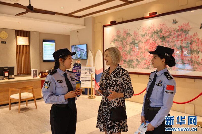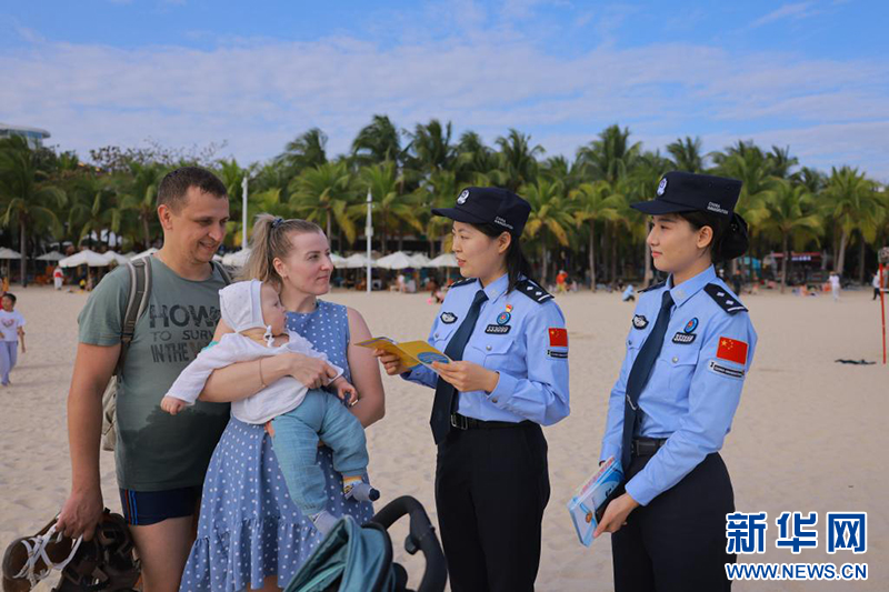 三亚边检站移民管理警察在大东海旅游区向外籍旅客宣传讲解入境免签政策。新华网发(丛高 摄)
