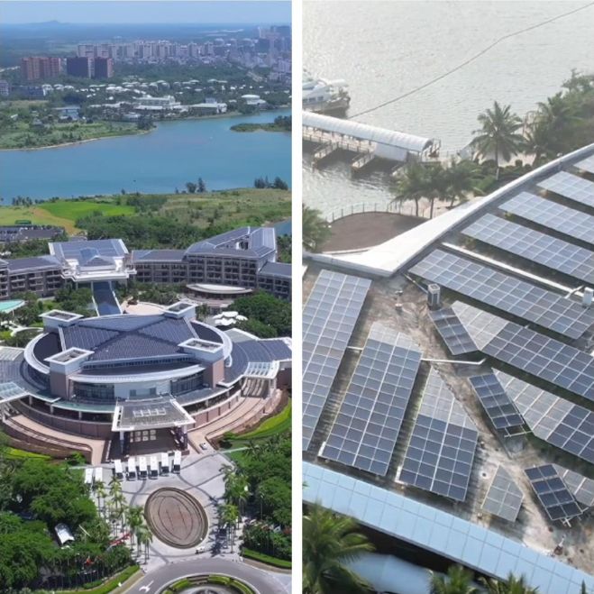 会址所在地海南博鳌东屿岛上的近零碳示范区内,科技感十足的各类装备营造出绿色低碳生活新风尚。