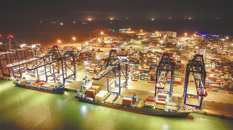 4月8日,夜幕下繁忙的洋浦国际集装箱码头。海南日报全媒体记者 陈元才 摄