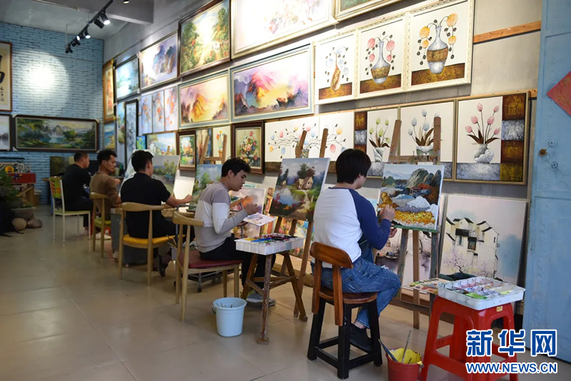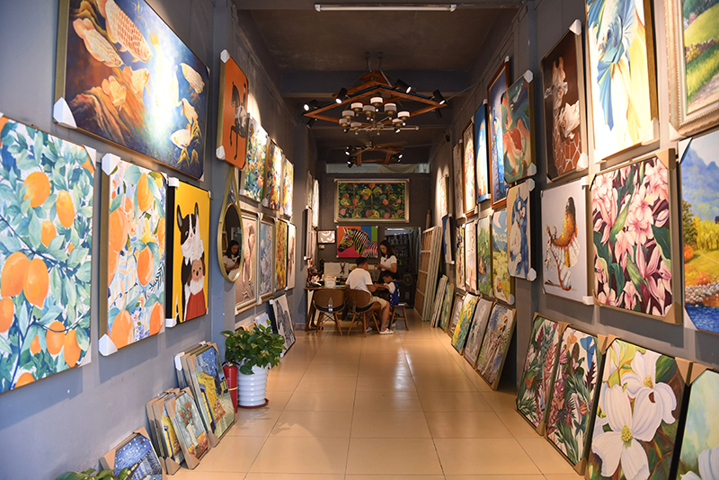 外来画家的加盟,使屯昌油画产业从“单打”走向“集群”。本地共有画家、画师、画工78人,其中国家级美术家会员1人、省级会员16人,人才队伍稳定。现有27家相关企业,年均营业额近千万元,以墙绘、画作销售、私人定制为核心业务,服务覆盖省内酒店、学校、乡村文化墙及政府工程,并逐步拓展至省外及国际市场,总订单量超2000单,其中国外订单超100单。油画步行街已成为旅游网红打卡点,吸引了大量游客前来参观体验,仅今年上半年,来访游客近7万人次。