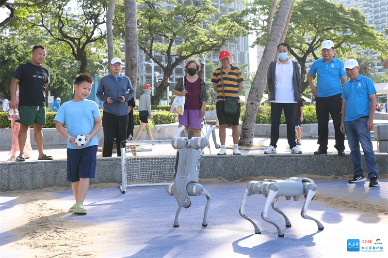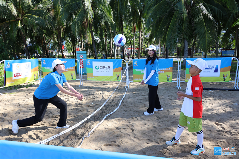 活动现场设置了三人篮球、沙滩足球、柔术、卡巴迪和沙滩排球等五个亚沙会竞赛项目体验区,同时还特别增设了科技感十足的AI人工智能机器狗、机器人互动体验区。参与群众在碧海蓝天的映衬下,既能欣赏迷人海景,又能沉浸式体验各项沙滩运动的独特魅力,还能获得三亚亚沙会专属纪念品。现场欢声笑语不断,大家在各体验区跃跃欲试,感受着沙滩运动带来的快乐。