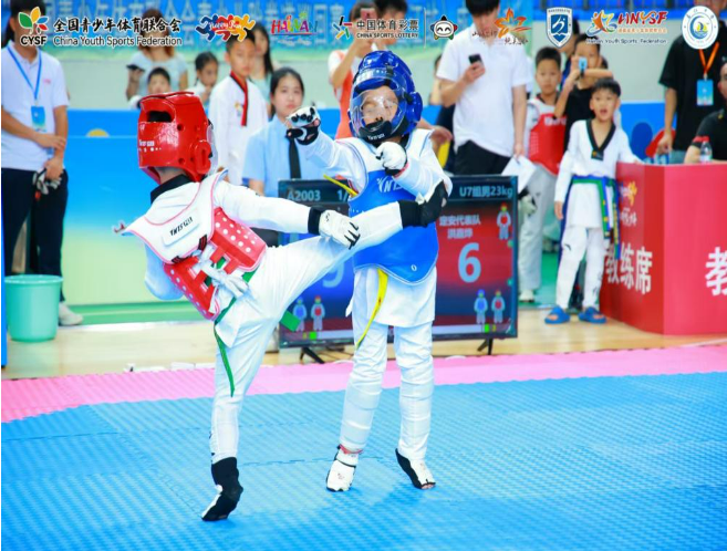 赛场上,选手们个个精神抖擞,斗志昂扬。品势赛中,他们一招一式刚劲有力,将动作的精准与韵律展现得淋漓尽致;竞技赛中,选手们灵活闪躲、迅猛出击,腿法凌厉似风。每一次踢击、每一声呐喊,都彰显着对跆拳道的热爱与执着。场边观众掌声与呐喊声不断,为少年们的每一次精彩表现喝彩,山海间的赛场满是青春热血的气息。