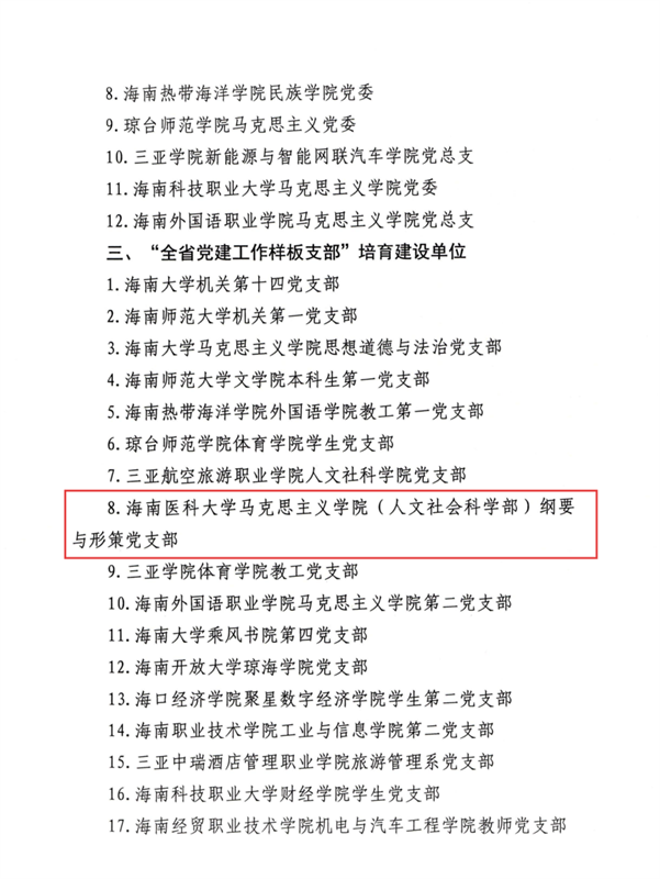 同时,海南医科大学第三联合(护理与西英联合)党委入选“全省党建工作标杆院系”培育建设单位,马克思主义学院纲要与形策党支部入选“全省党建工作样板支部”培育建设单位,生命科学与医学技术学院功能材料与分子影像党支部书记工作室(原急诊创伤学院教工第二党支部书记工作室)入选“双带头人”教师党支部书记工作室培育建设名单。