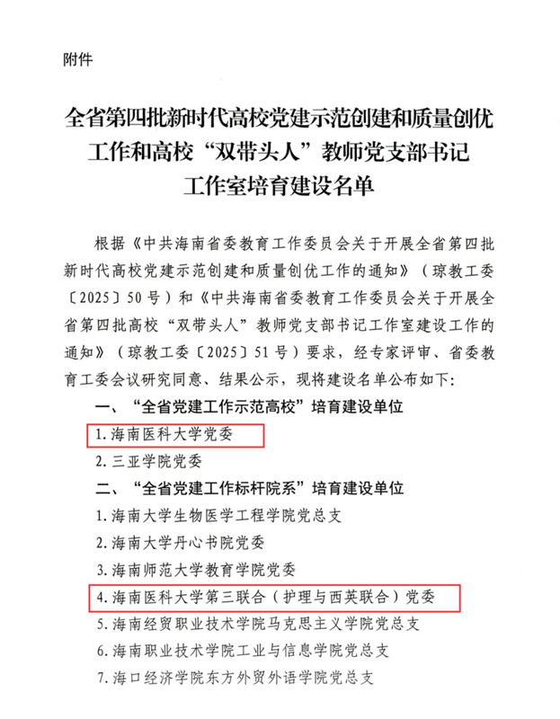 近日,中共海南省委教育工作委员会公布全省第四批新时代高校党建示范创建和高校“双带头人”教师党支部书记工作室培育建设名单。海南医科大学党委入选“全省党建工作示范高校”培育建设单位。