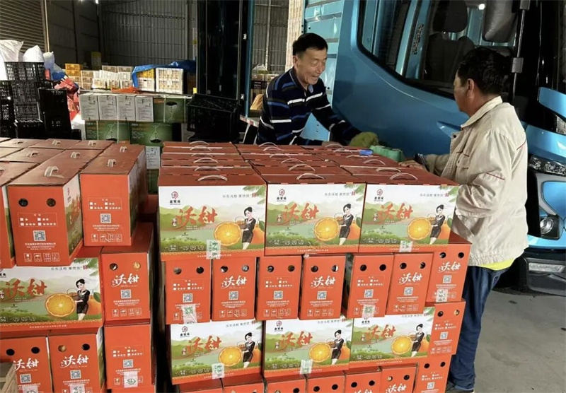 工人们正在搬运成箱的乐东沃柑。