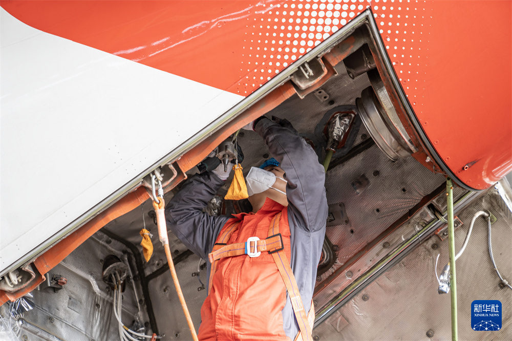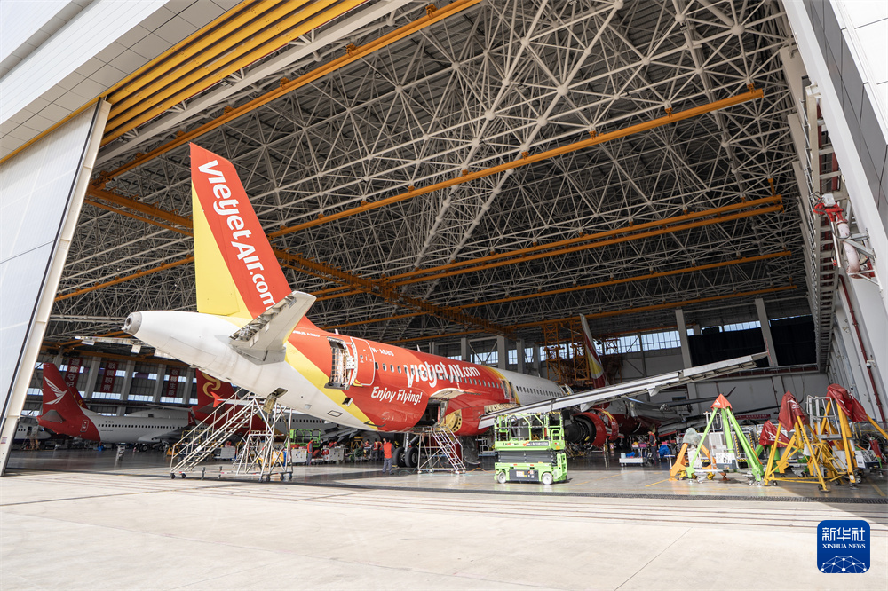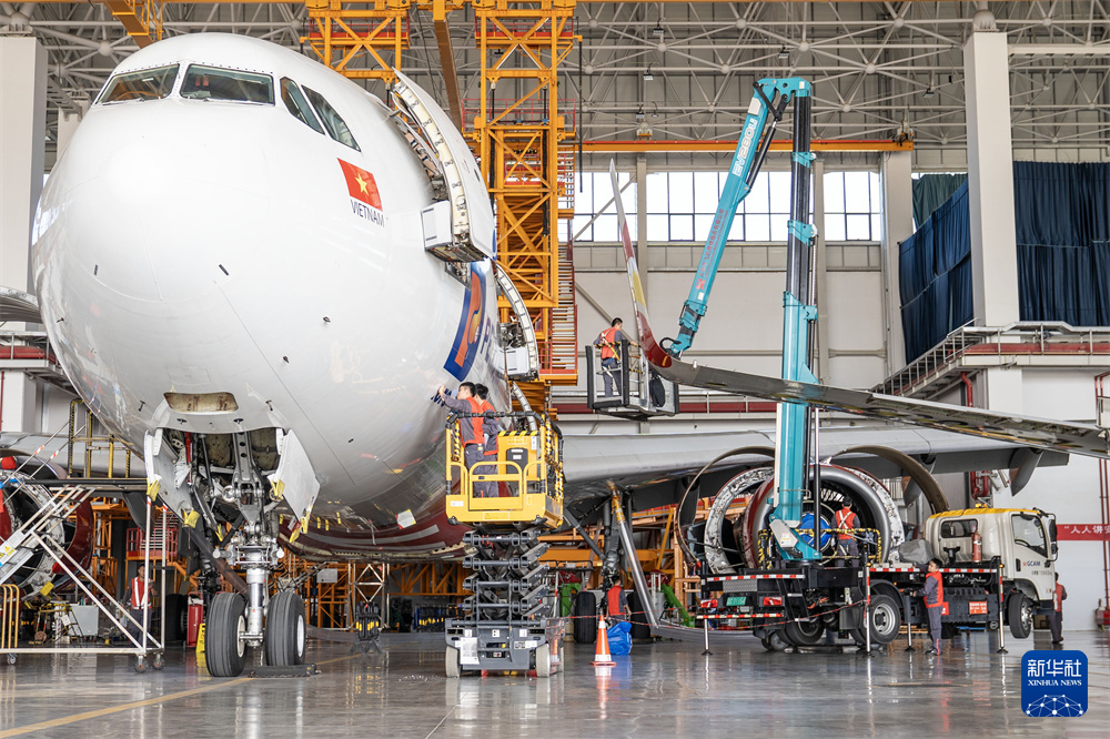 11月21日,海航技术旗下大新华飞机维修服务有限公司的机务维修人员对进境飞机进行检修。新华社记者 张丽芸 摄